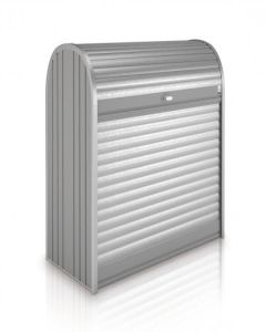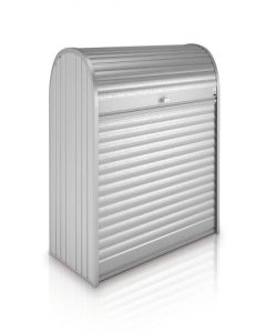 oberen Rolladens. Der untere Rolladen wird beim Öffnen ebenfalls nach hinten geschoben. Mit StoreMax® verstauen Sie sicher und auf attraktive Weise Mülltonnen, Mülltrennsystem, Rasenmäher, Gartengeräte und -werkzeuge, Grill, Sportgeräte, Gartenmöbel, Gastronomie, Fahrräder, für Camping und vieles mehr! Auch als Fahrradgarage ideal geeignet. StoreMax® ist die exklusive Aufbewahrungsbox mit praktischem Rollladen-System für den schnellen Zugriff. Anders als bei herkömmlichen Mülltonnenboxen aus Metall, stört bei StoreMax® weder eine weit aufstehende Tür noch kann ein Deckel plötzlich zurückklappen. Denn StoreMax® lässt sich durch ein zweigeteiltes Öffnungs-System öffnen. So können Sie wahlweise die Box oben und/oder vorne öffnen - ganz wie Sie es möchten. Die leicht gleitenden Rollläden aus beschichtetem Aluminium können weder rosten noch verwittern und bleiben so dauerhaft einsatzbereit. Eine Federunterstützung macht die Bedienung der beiden Rollläden zum Kinderspiel. Für die nötige Stabilität und Robustheit der Gerätebox sorgen die aus feuerverzinktem, polyamid-einbrennlackiertem Profilstahl gefertigten Rück- und Seitenwände.